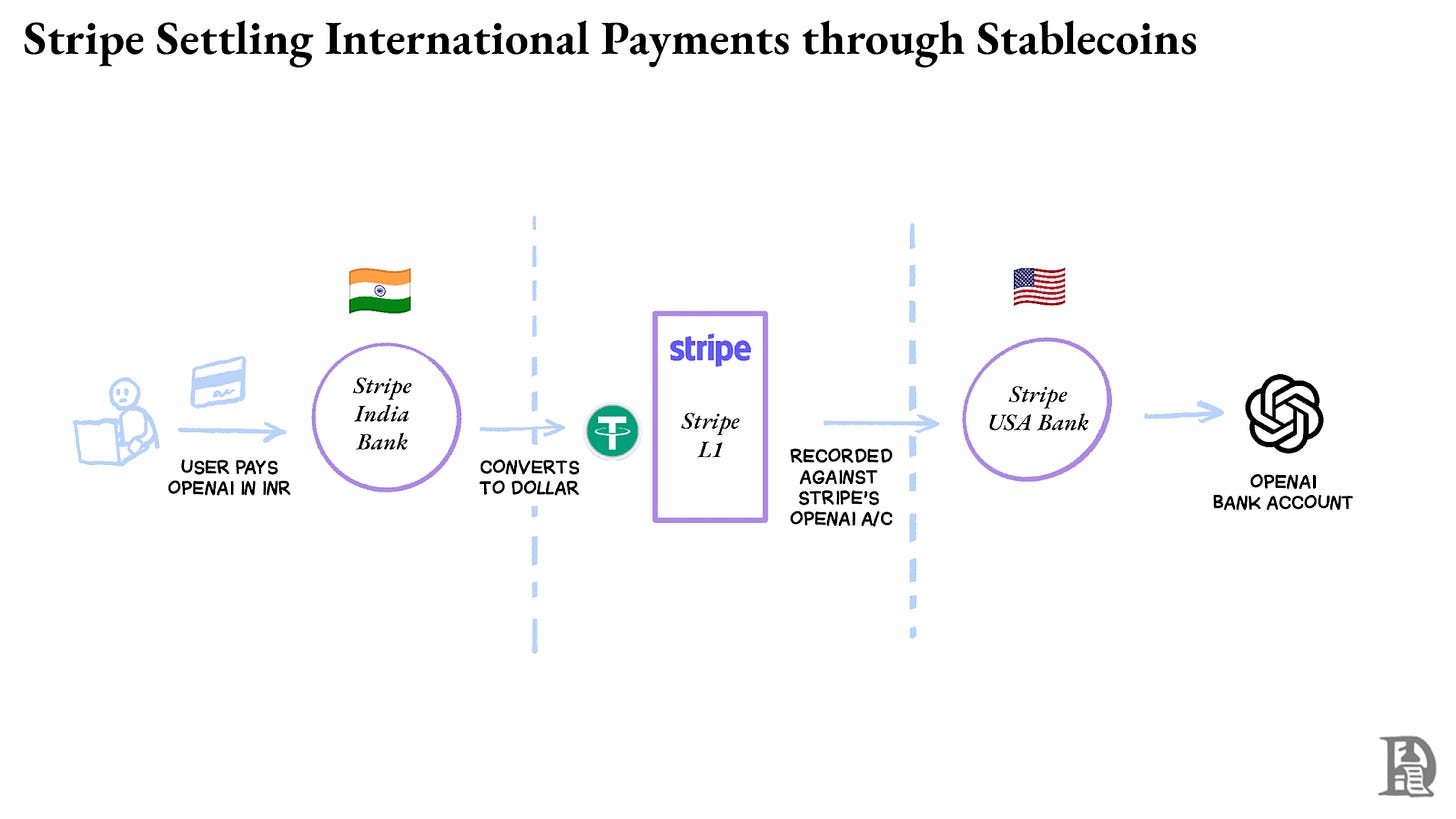 To understand how they may monetise, consider the transfer below for the payment of a ChatGPT subscription from a developer in India. In a hypothetical future, Stripe could circumvent SWIFT entirely by using its own L1 for transferring capital and using local stablecoin liquidity to convert the money to regional currencies.
