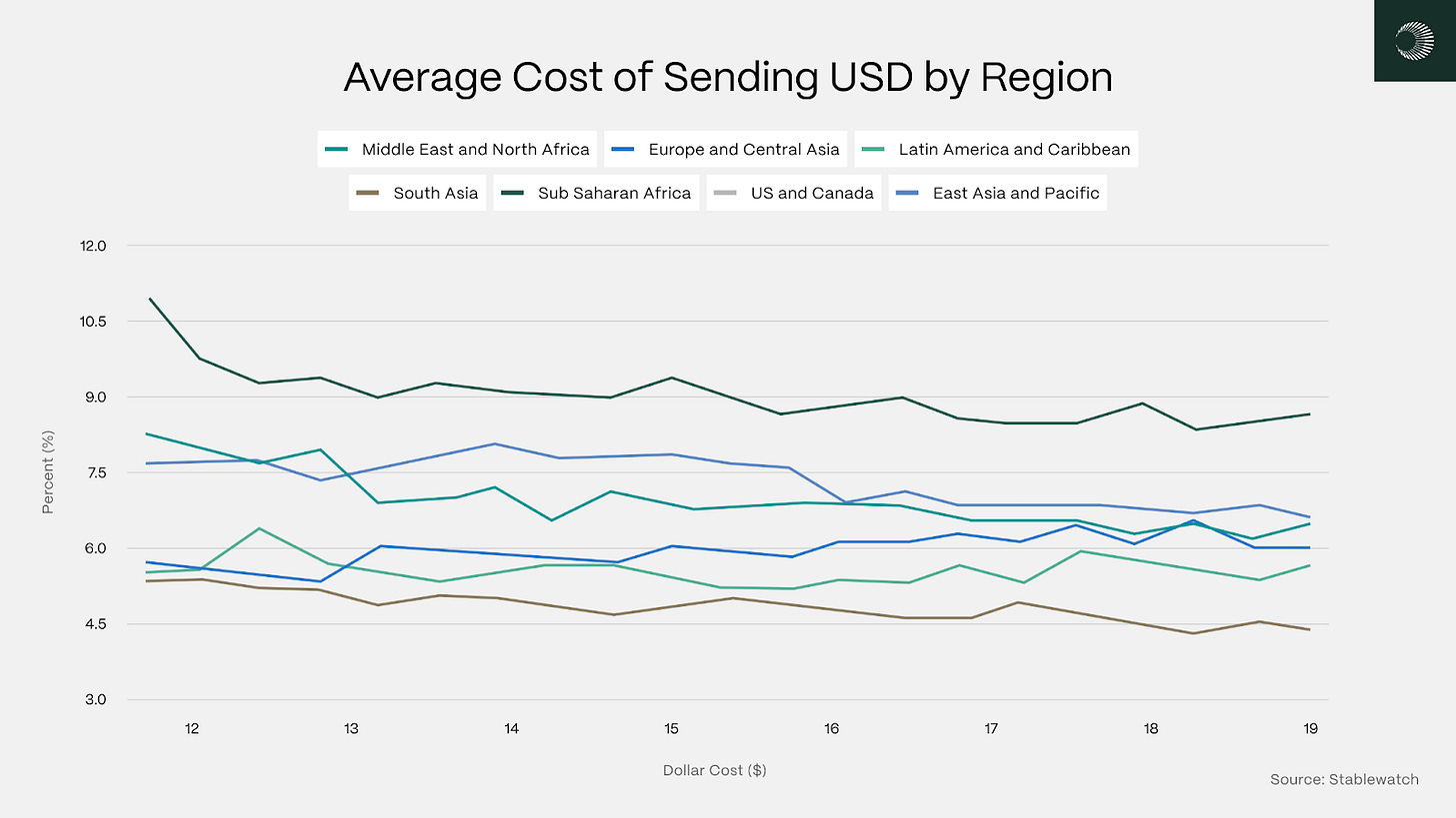 Stablecoins represent a natural alternative. With regulatory clarity from frameworks like the GENIUS Act, they’re becoming safe, compliant representations of major currencies. The cost of stablecoin transfers averages under 1% for any transfer size, regardless of destination.