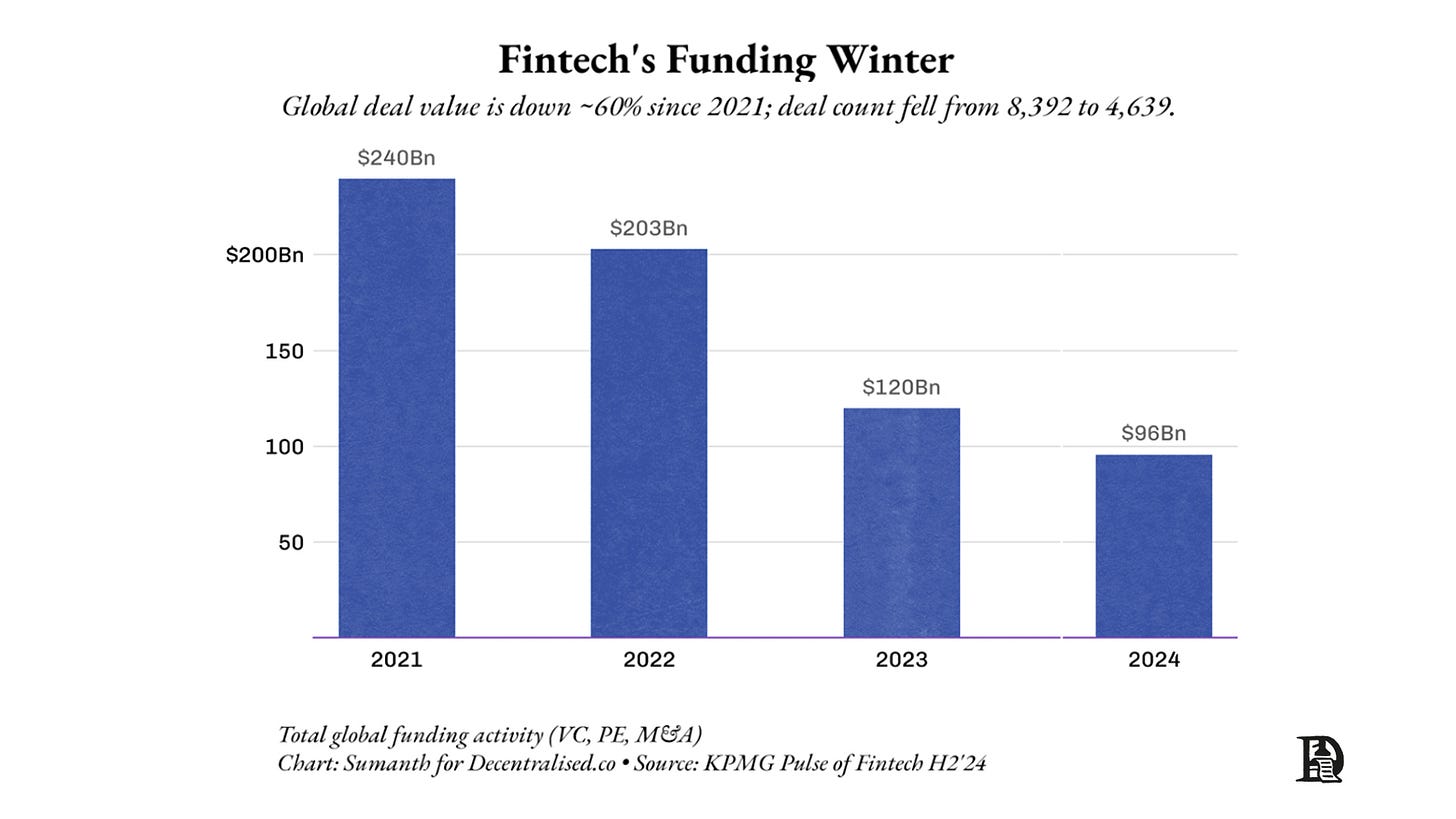 VCs understand this struggle. Since 2021, the total money flowing to fintech startups has halved. Historically, much of the moat in fintech startups was regulatory. This is why banks claimed the largest slice of the banking revenue pie. But when a bank misprices risk, it gambles with depositors’ money, as we saw with the Silicon Valley Bank.