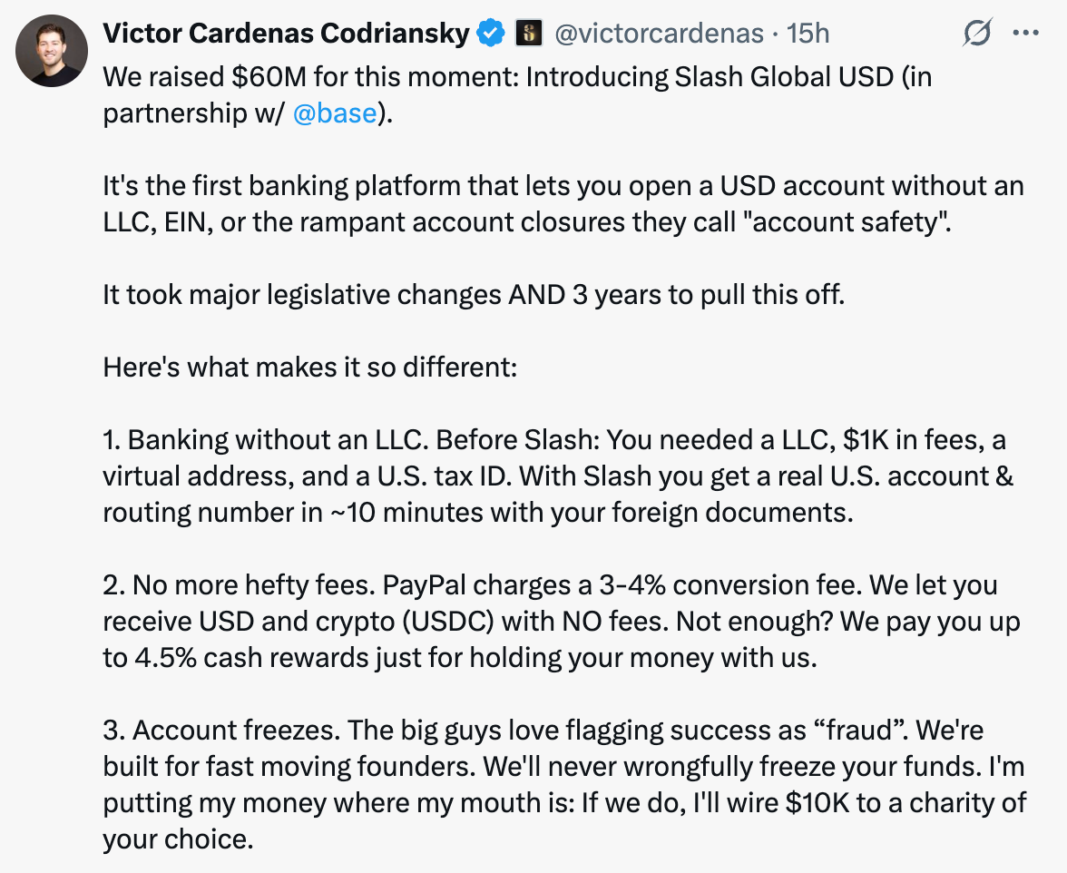 These rails invite new players to join with much lower costs. YC-backed Slash lets any exporter start accepting U.S.-customer payments in five minutes—no Delaware C-corp, no acquirer contract, no paperwork, no lawyer retainer— just a wallet. The message to legacy processors is blunt: upgrade to stablecoins or lose the swipe revenue.