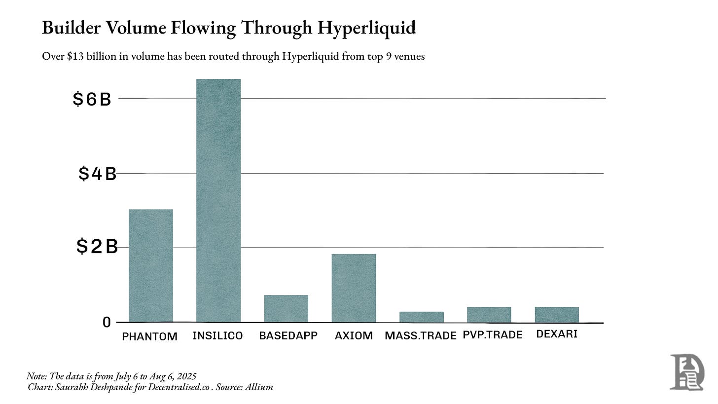 In addition to Hyperliquid’s own venue, over $13 billion in volume has flown through it from other builders over the last month. Phantom has earned over $1.5 million by routing $3 billion in volume through Hyperliquid. This shows how powerful Hyperliquid’s network effects are at the moment.