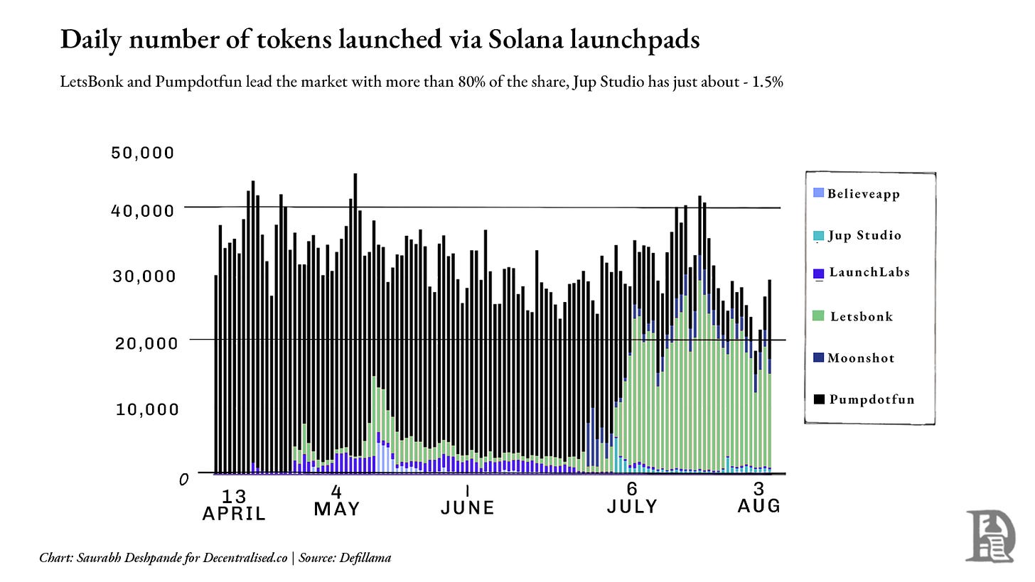 But the growth on some of these metrics is yet to kick in. Take the launchpad segment for example. Market leaders Pumpdotfun and LetsBonk control more than 80% of daily token launches, while Jup Studio and Moonshot together account for less than 10% of the market. The chart below shows how dominant the incumbents remain. In this case, the default may already be entrenched, and Jupiter might have to take a very different approach if it wants to dislodge it.