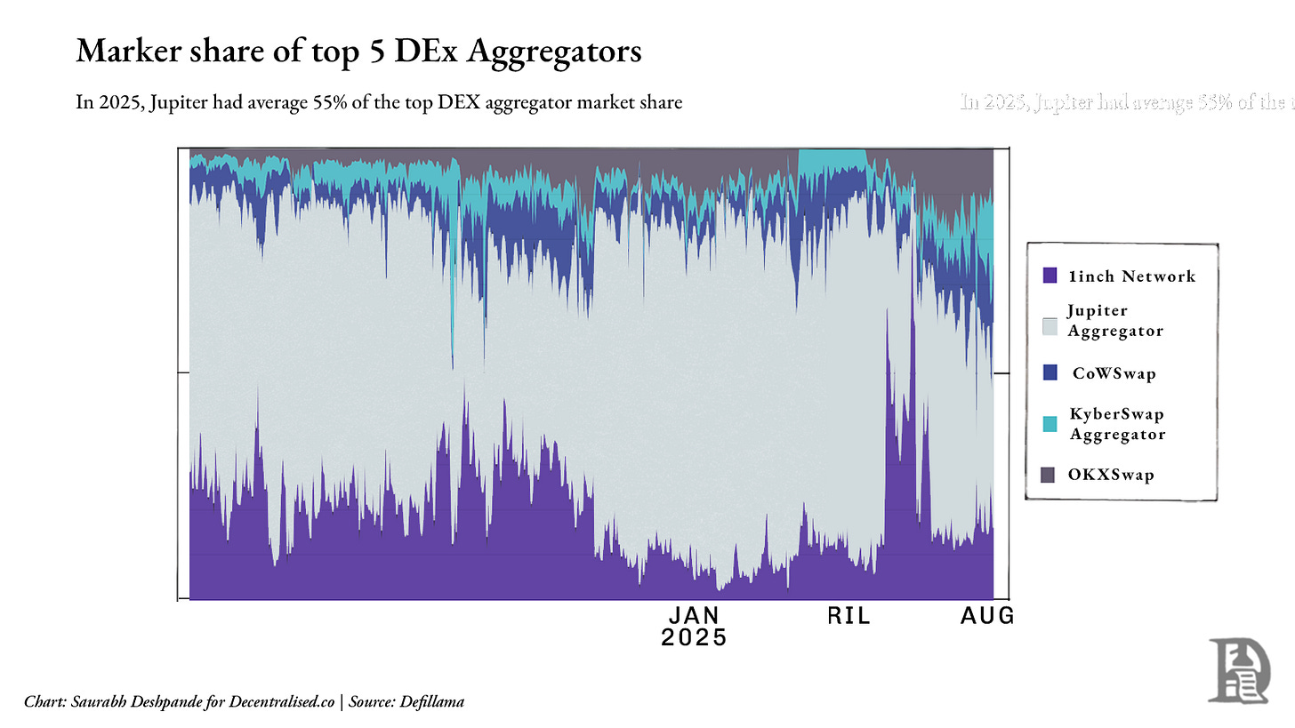 But it’s important to zoom out. While Jupiter may be dominant within Solana, it still faces stiff competition at the industry level. On a broader cross-chain basis, 1inch, CoWSwap, and OKX Swap remain meaningful competitors. As of 2025, Jupiter has averaged around 55% of the market share among the top five DEX aggregators, but that figure fluctuates based on chain activity and integrations. The chart below shows just how fragmented the aggregation layer still is outside Solana.