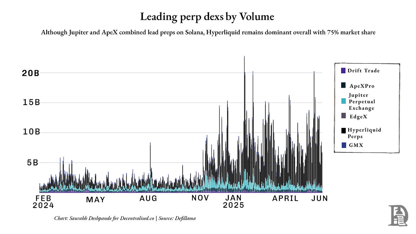But perps, perhaps more than any other product, reveal the limits of that approach — at least for now. Jupiter has made inroads on Solana, but Hyperliquid still dominates globally, with roughly 75% of the perp DEX market share. The chart below shows how far ahead Hyperliquid is in terms of raw trading volume: