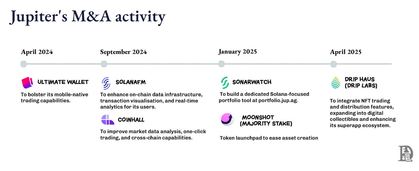 Here, founder energy becomes a wedge. Acquiring teams with strong founder DNA lets Jupiter break into spaces it doesn’t natively understand, like NFT culture with DRiP or mass retail token issuance, without diluting its core focus. Those founders already know their segment, have communities that trust them, and can move quickly. Plugging them into Jupiter’s distribution channels amplifies their reach overnight, while Jupiter gains a new flow of users and liquidity.