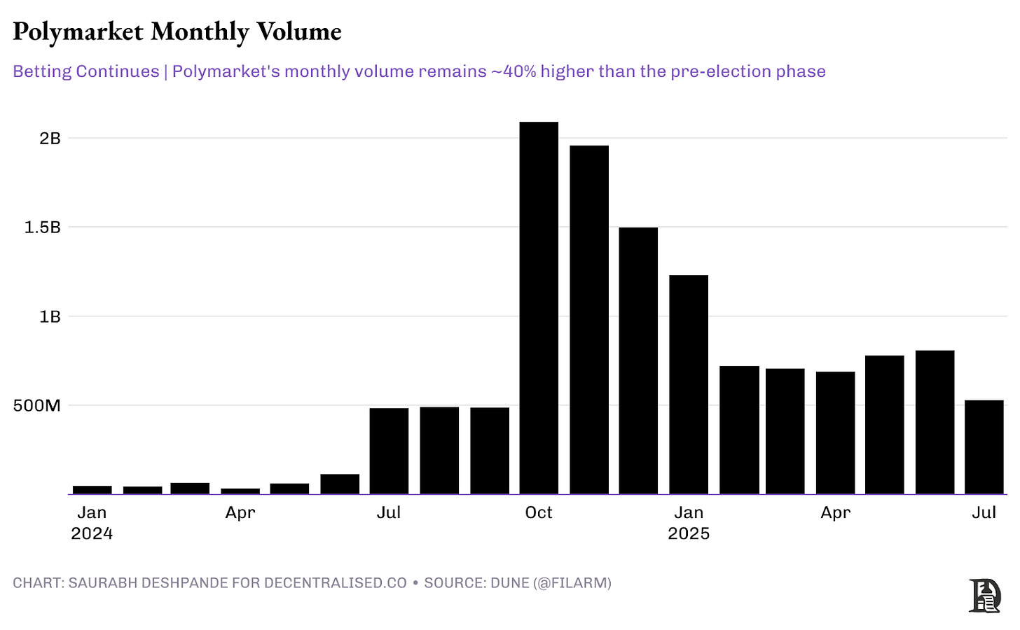 What both platforms enabled was a market for public attention and probabilistic truth. They turned information into something you could price. In the same way that oil futures hedge supply shocks, prediction markets hedge consensus. They allow traders to arbitrage reality, and by doing so, reveal what the crowd actually believes. In that sense, they brought volatility to information itself. As we argued in our previous article on Volatility as a Service, products that offer volatility over sustainable periods of time tend to win. And that’s what is at the core of Polymarket’s success.