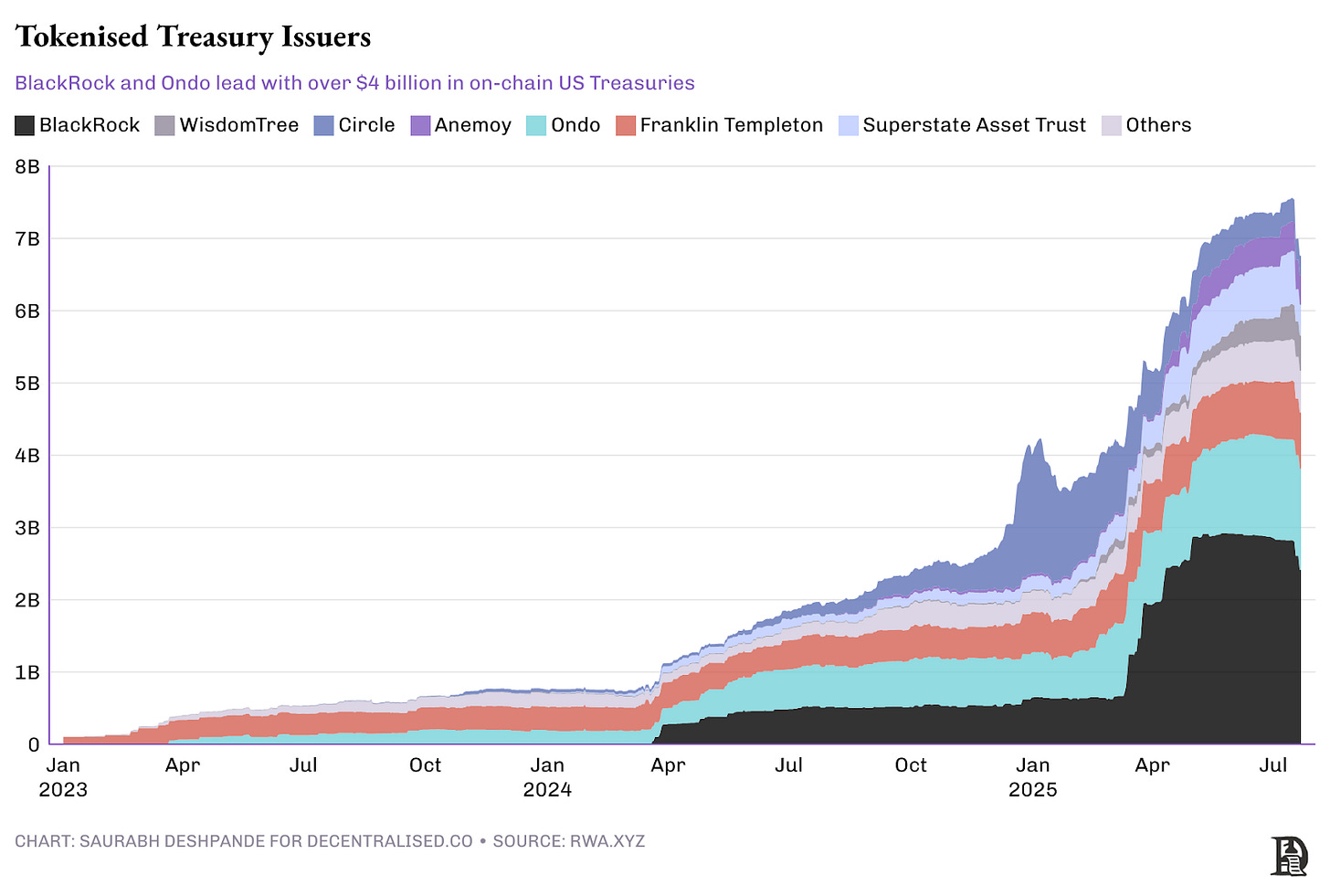 These things belong to a category that resembles dollars, but aren’t quite stablecoins and aren’t quite cash either. They live on blockchains, they earn yield, and they’re issued by firms like Securitize and Ondo Finance, which are trying to bring the stuff of traditional finance, like government bonds, treasury funds, and money markets, onto crypto rails. You might’ve seen BUIDL, a tokenised fund launched by BlackRock in partnership with Securitize. It holds short-term U.S. Treasuries and repos—basically, the boring, safe stuff you’d find in a money market fund. But instead of being tucked away in your Fidelity account, BUIDL exists as a digital token on the Ethereum blockchain.
