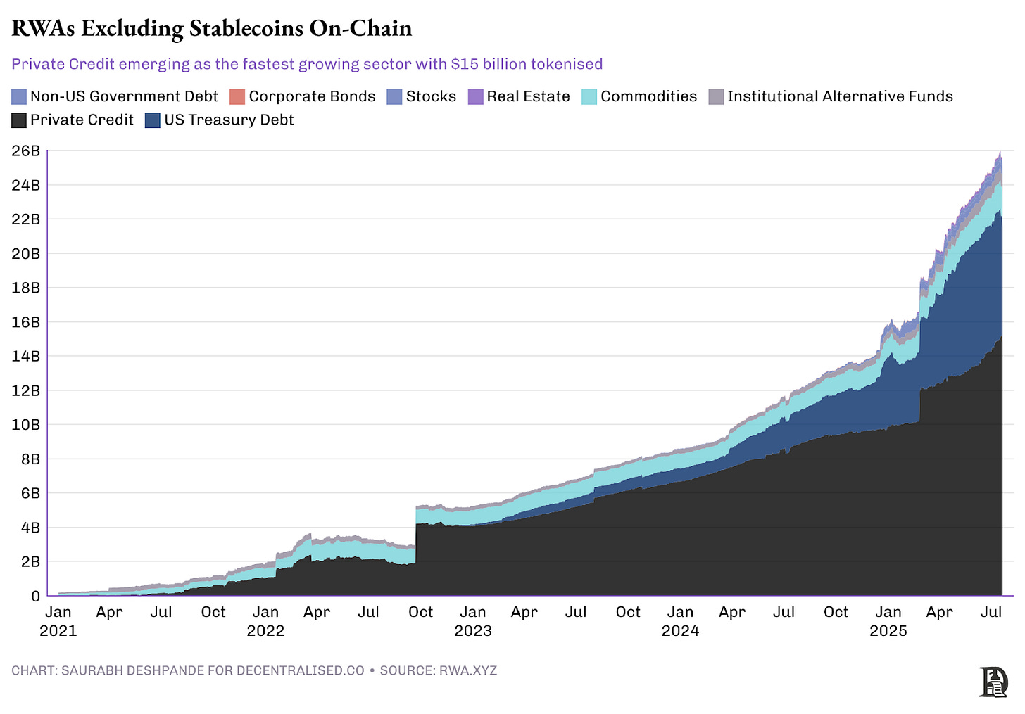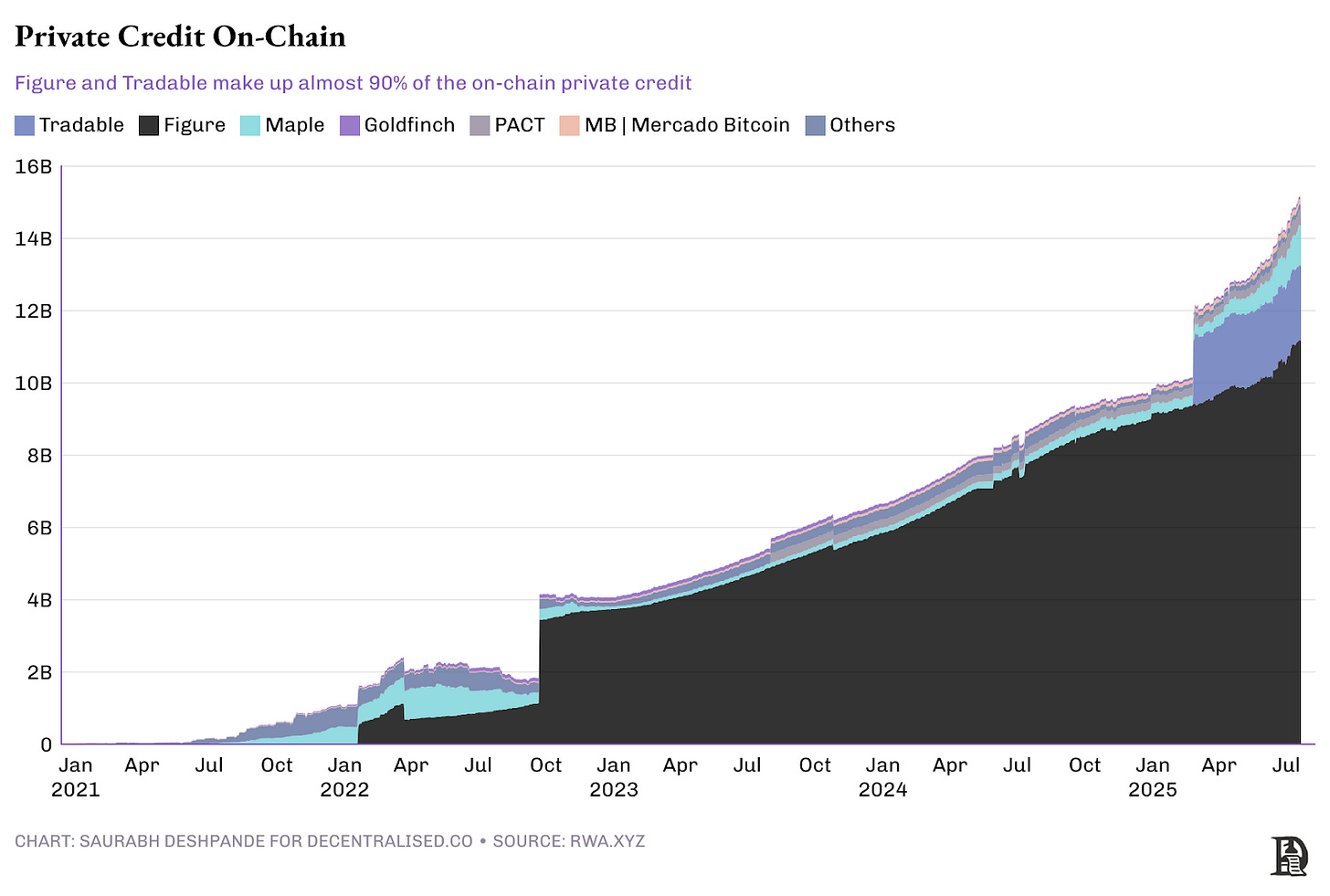 With the exception of stablecoins, the on-chain RWA market grew from about $5 billion in 2022 to over $25 billion by mid-2025. That’s a 400% increase, making RWAs one of crypto’s fastest-growing segments, second only to stablecoins. The growth was fueled by private credit and US Treasury debt. At approximately $15 billion, private credit has been the highest-growing segment within RWA, led by companies like Figure, Tradable, and Maple Finance with ~$11 billion, $2 billion, and $878 million in active loans, respectively.