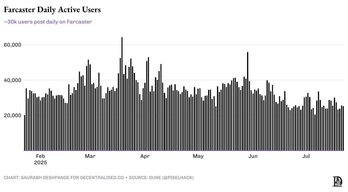 Farcaster takes a lighter approach. Minimal on-chain footprint, but full social portability. Clients read from the same shared network, and user identity is tied to Ethereum addresses. No platform lock-in. Farcaster’s value addition is continuity (or the assurance that you can carry your online identity, social relationships, and audience with you wherever you go), not content. Farcaster consistently has ~30,000 users who cast (post) something daily.
