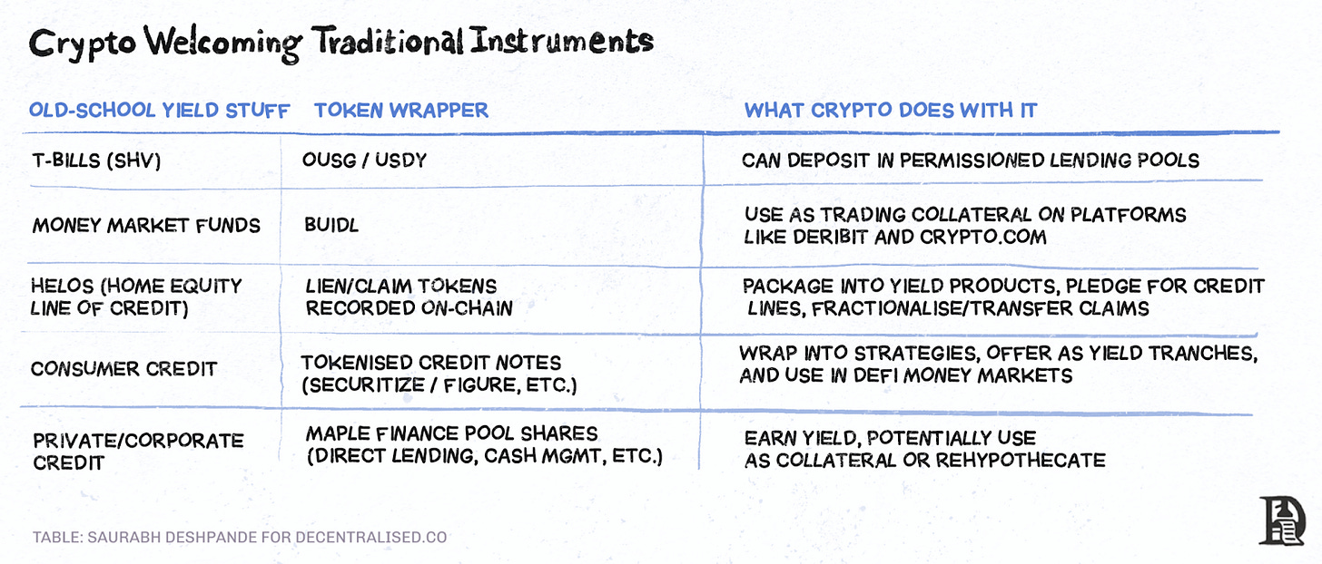 This opens up a more speculative question: if this works for Treasuries and home equity, what comes next? Maybe credit card receivables. Maybe equipment leases. Maybe my friend who is finishing up his superspecialty in urological surgeries can sign a financing agreement on-chain. Because when he performs a few surgeries every day, there’s a predictable stream of income. If it pays a predictable return and can be documented, there’s a case to tokenise it.